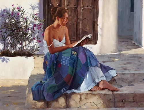 Gosto desta pintura, das sombras e da luminosidade do sol, das cores, dos loendros (?), dos pés descalços sob a pedra que aparenta transmitir frescura, da alça da blusa que cai descaradamente pelo ombro, da mulher que parece que lê sem prestar atenção às palavras e que a qualquer momento pode virar a cara para quem a observa. Gosto da saia que é parecida com a minha.